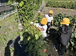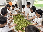 地域の方にお世話になって枝豆を収穫させていただきました。6月に種をまき、苗を植えた後、地域の方が無農薬で手間暇かけて育ててくださいました。とても立派な枝豆がたくさんついていて子どもたちも大喜び。夢中で収穫をしました。